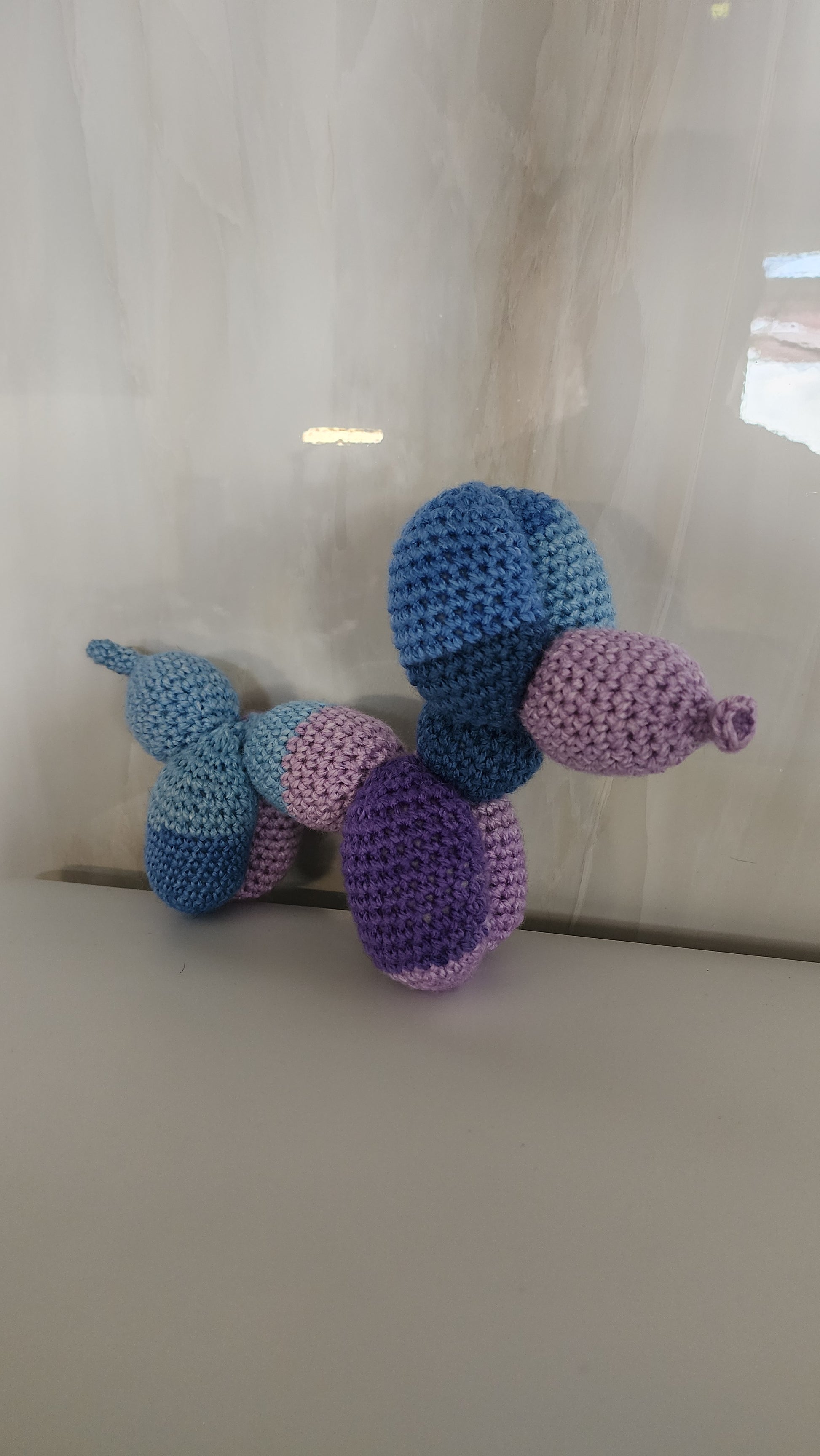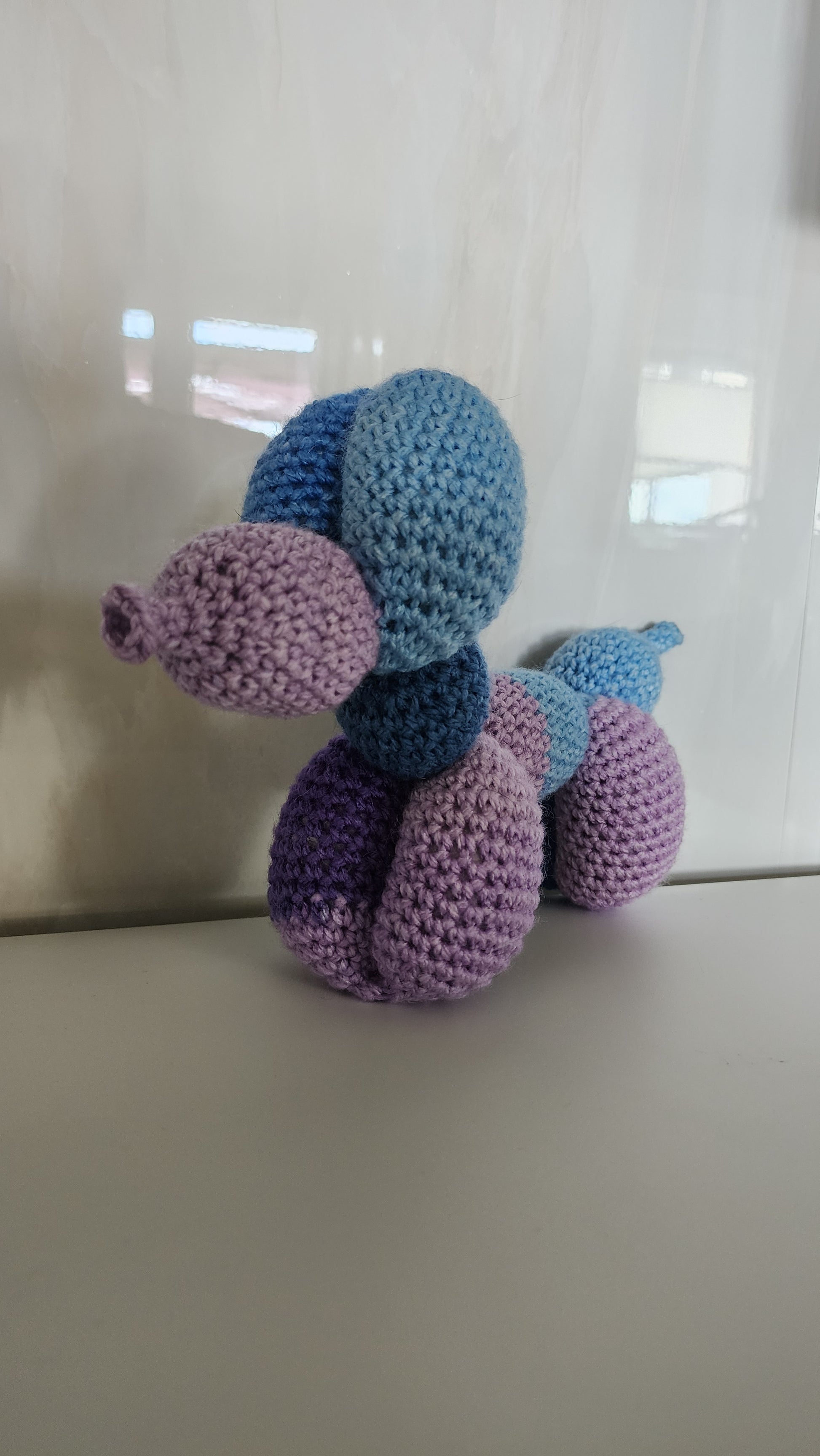 Handmade crochet balloon dog made with blue/purple variegated acrylic yarn