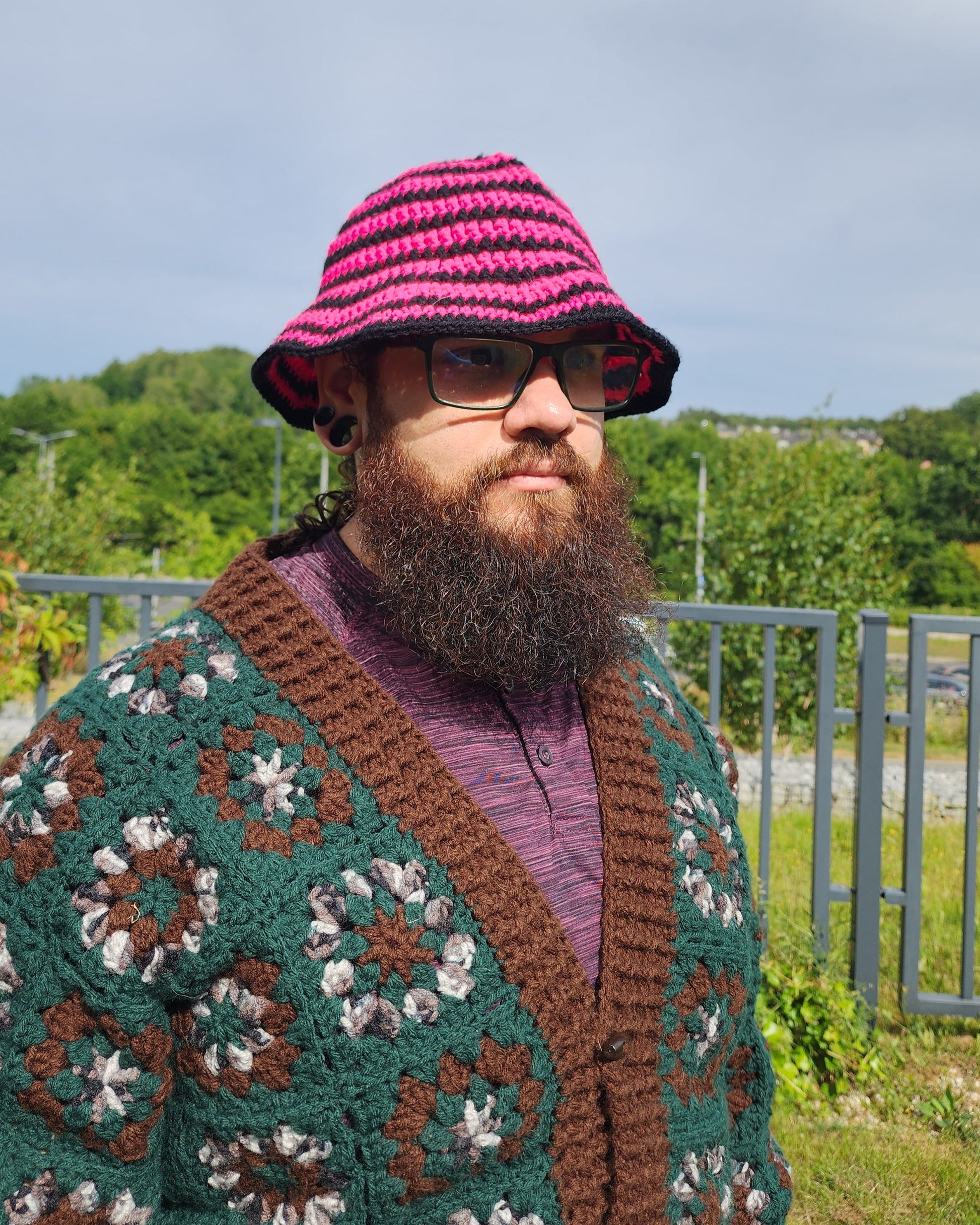 Adult-sized spiral bucket hat handmade using acrylic yarn